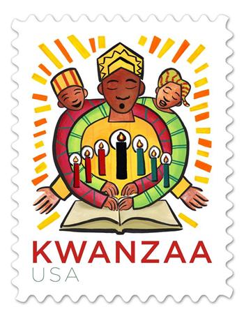 Complement your greetings conveniently with the Kwanzaa (Forever®) stamp design. The prominent colors in the artwork represent the colors of the Kwanzaa flag — green for growth, red for blood, and black for the African people. Your order will be processed with an inventory of readily available stamps in the series. When you order stamps, we affix them to your envelope. Design may vary.
